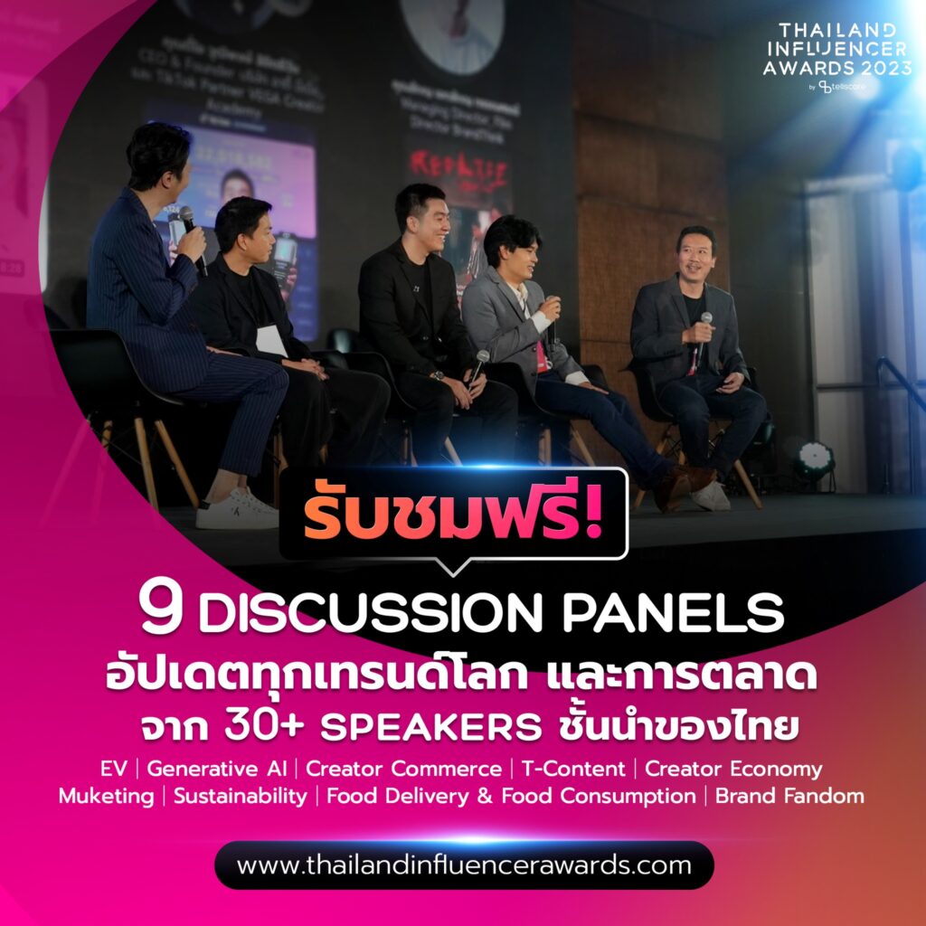 พิเศษ ! วันนี้ทาง Tellscore ได้เปิดให้รับชมคลิปย้อนหลังจากเวทีเสวนาทั้ง 9 Disucssion Panel ได้ฟรี โดยสามารถลงทะเบียนรับชมได้ที่ https://www.thailandinfluencerawards.com/awards/2023?tab=discussion-panels