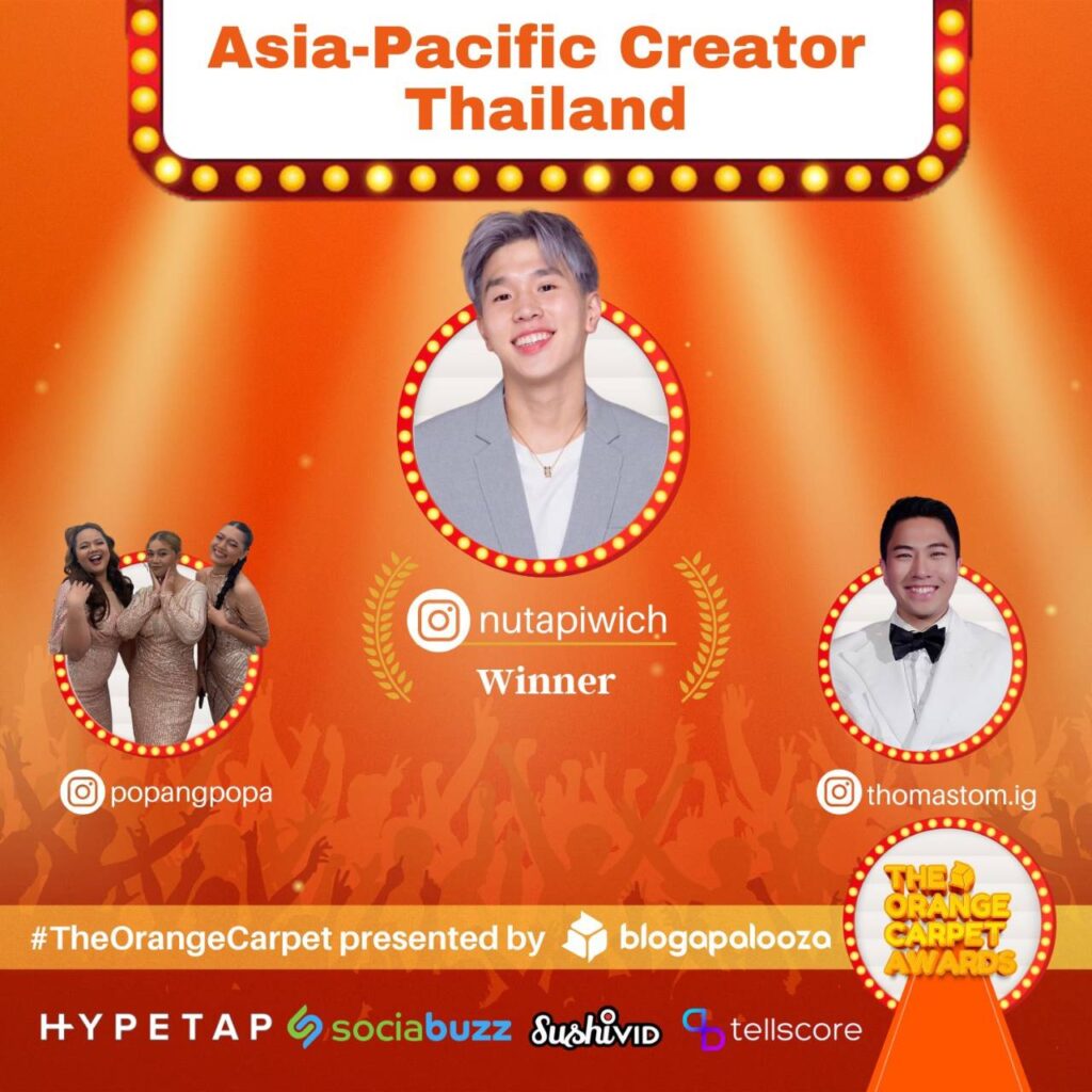 เรียกได้ว่าเป็นข่าวดีไม่น้อยสำหรับวงการอินฟลูเอนเซอร์ และครีเอเตอร์ของประเทศไทย หลัง 3 อินฟลูฯ ชั้นนำของไทย ได้แก่ Popangpopa Channel, NutApiwich และ Thomas Tom ที่ได้รับรางวัลสุดพิเศษในหมวด “Asia-Pacific Creator Choice Award” หรือ “รางวัลครีเอเตอร์ยอดเยี่ยมในเอเชียแปซิฟิก” จากงาน #TheOrangeCarpet ซึ่งจัดโดยบริษัท blogapalooza จากฟิลิปปินส์ ซึ่งได้มีการเฟ้นหาครีเอเตอร์ที่กำลังน่าจับตามองจากหลาย ๆ ประเทศในภูมิเอเชียแปซิฟิก ได้แก่ ไทย, มาเลเซีย, อินโดนีเซีย และออสเตรเลีย